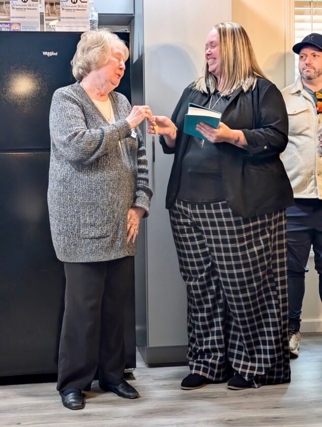 - Habitat for Humanity of the Mid-Ohio Valley board member Carolyn Garrity presents Alisa Pisula with the keys to her new house as Pisula holds a Bible given to her by Garrity and the organization Sunday at the house in Parkersburg. (Photo by Evan Bevins)
