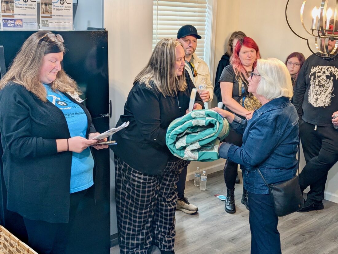 - Pat Barker, right, with the Senior Stitchers group presents Alisa Pisula with a quilt during a dedication of Pisula’s new Habitat for Humanity-built home Sunday afternoon in Parkersburg. (Photo by Evan Bevins)