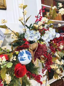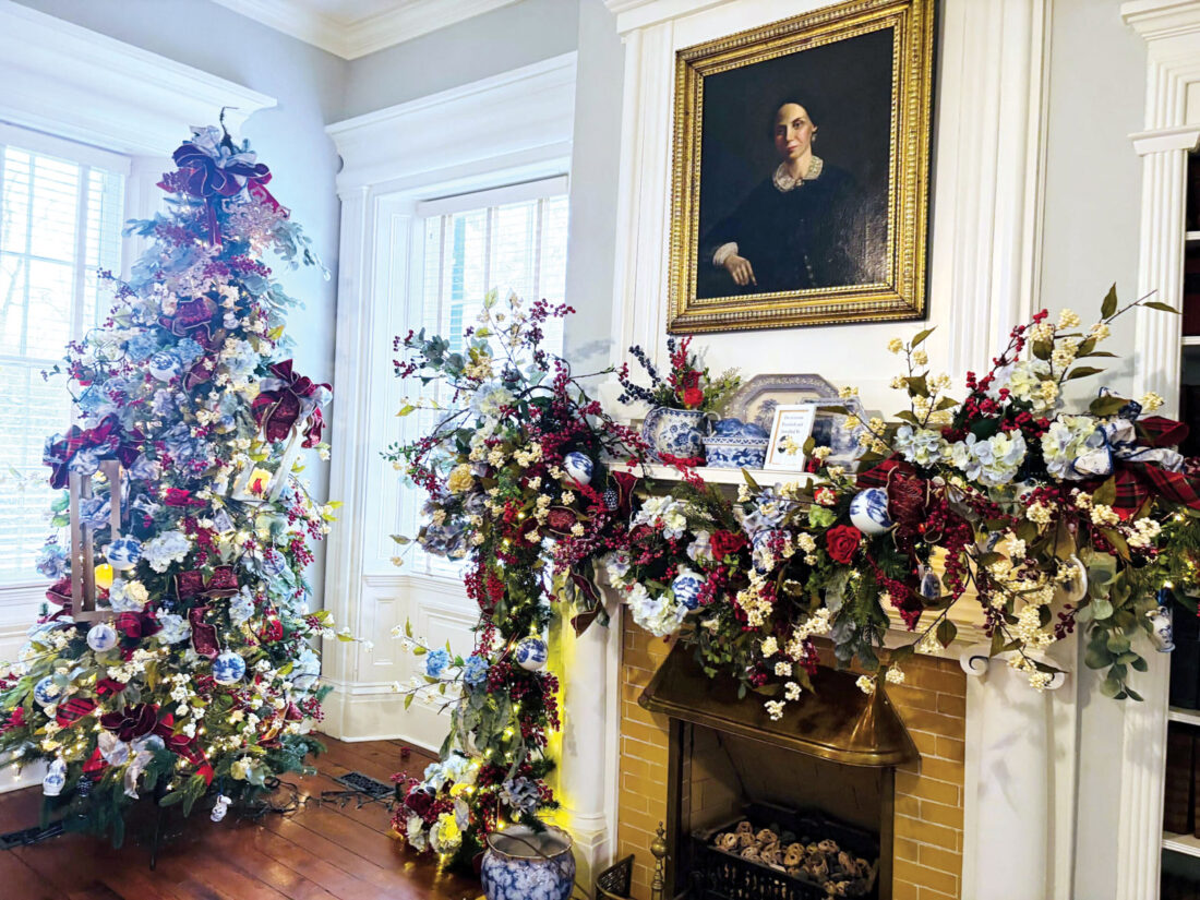“The Oakland Dining Room evokes the understated sophistication of a Colonial Christmas, featuring topiaries and olive greens, while the Back Parlor delights with a patriotic palette of blue, red, and white, inspired by the estate’s historic collection of blue and white pottery now gracing the mantle,” McClung said. “Every room offers a feast for the eyes. The Historic Oakland Estate is truly dressed in holiday splendor.”