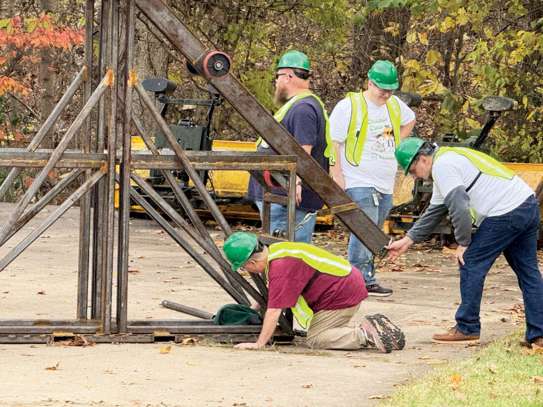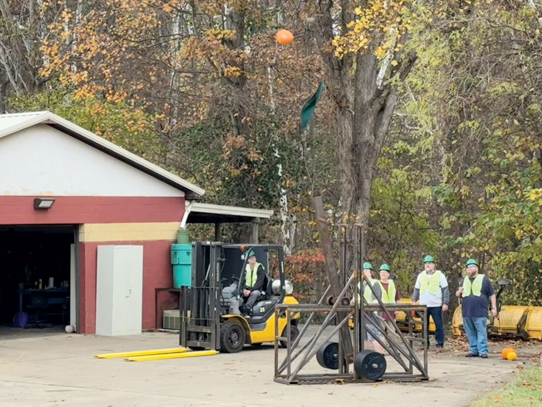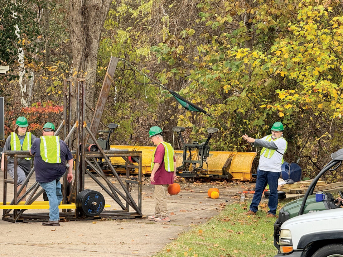 - The maintenance crew loads a pumpkin into the metal catapult during the pumpkin launching at Pumpkin Chuckin’ on Saturday. (Photo by Amber Phipps)