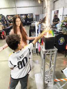 Shianna Cunningham and her brother Riker look at a sparkling device featured Sunday at the Marietta Monster Mash held this weekend at the Washington County Fairgrounds in Marietta. (Photo by Brett Dunlap)