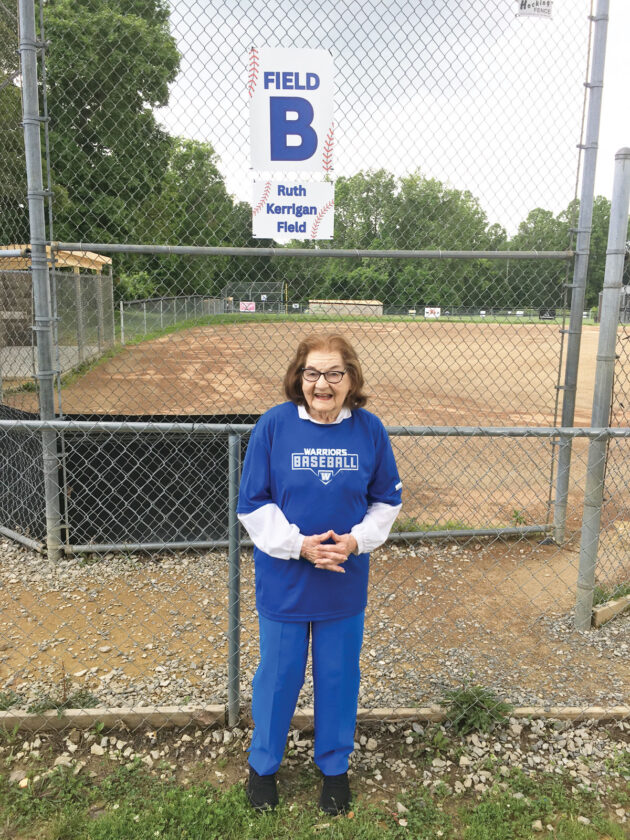 Ruth Kerrigan stands at Ruth Kerrigan Field at the Belpre Township Sports Complex on Federal Road. The field was dedicated in Kerrigan’s honor this year. She turns 94 today. (Photo Provided)