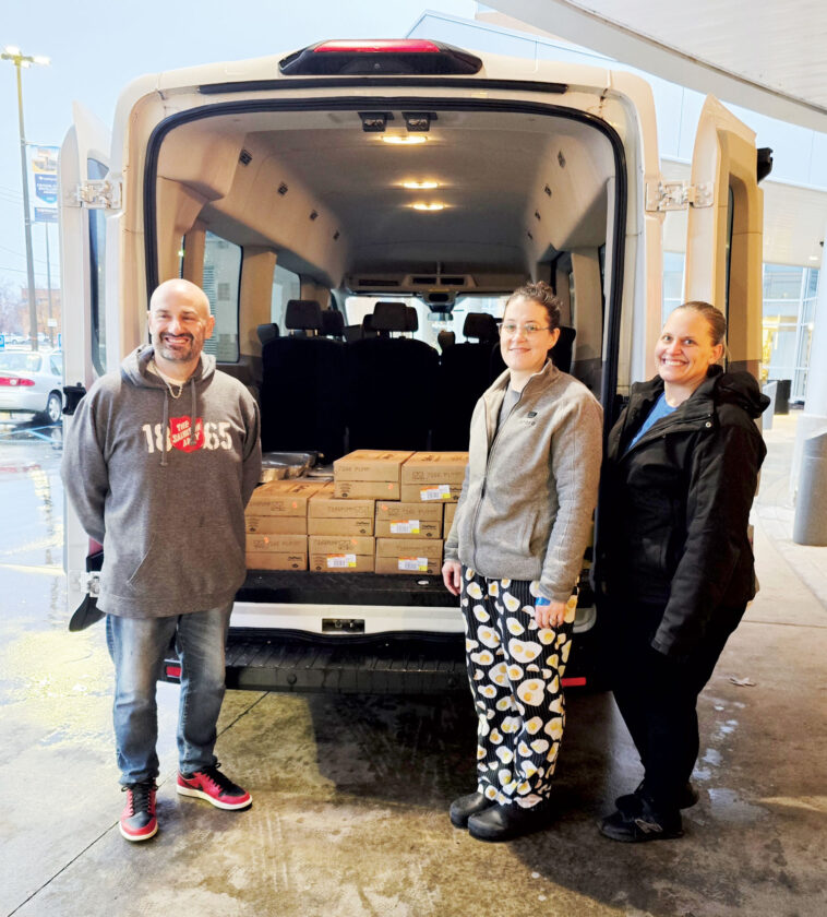 WVU Medicine Camden Clark Medical Center’s dietary team presented more than 1,000 pounds of turkey to the Salvation Army of Parkersburg on Tuesday morning for Thanksgiving on Thursday, when the organization will provide more than 1,200 meals through delivery and take-out. Pictured at the hospital’s South Tower, from left, are Salvation Army Lt. Anthony Rowe, Camden Clark Executive Chef Katie Augenstein and Camden Clark Dietary Supervisor Rochelle Weaver. (Photo provided by WVU Medicine Camden Clark Medical Center)