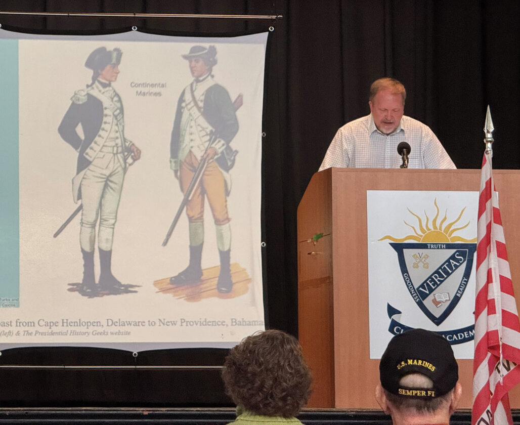 The Castle Museum Executive Director Scott Britton shares history about local marines in the 1700s during the U.S. Marine Corps 250th anniversary on Monday. (Photo by Amber Phipps)