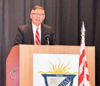 - Ohio House Rep. Kevin Ritter speaks briefly on the history of the U.S. Marine Corps and everything they’ve done for the country at the 250th anniversary of the marines celebrated at Veritas Classical Academy on Monday. (Photo by Amber Phipps)