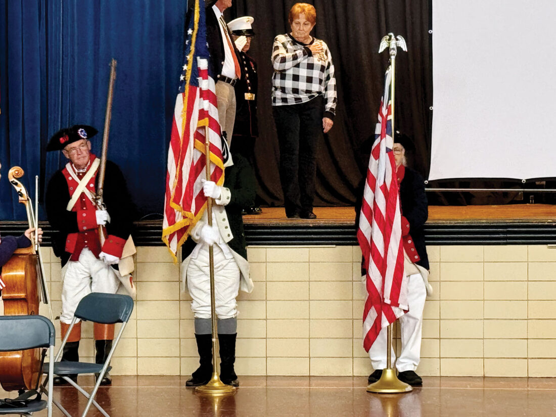 Members of the Marietta Chapter Sons of the American Revolution Color Guard post the colors during the 250th anniversary of the U.S. Marine Corps at Veritas Classical Academy on Monday. (Photo by Amber Phipps)