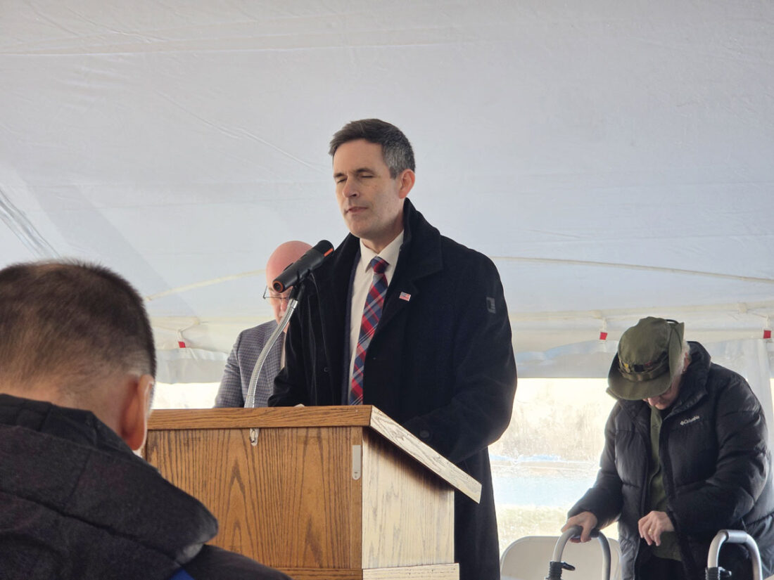 - Vienna Mayor Chad Emrick welcomes attendees to Vienna’s Veterans Day Celebration at Spencer’s Landing. (Photo by Gwen Sour)