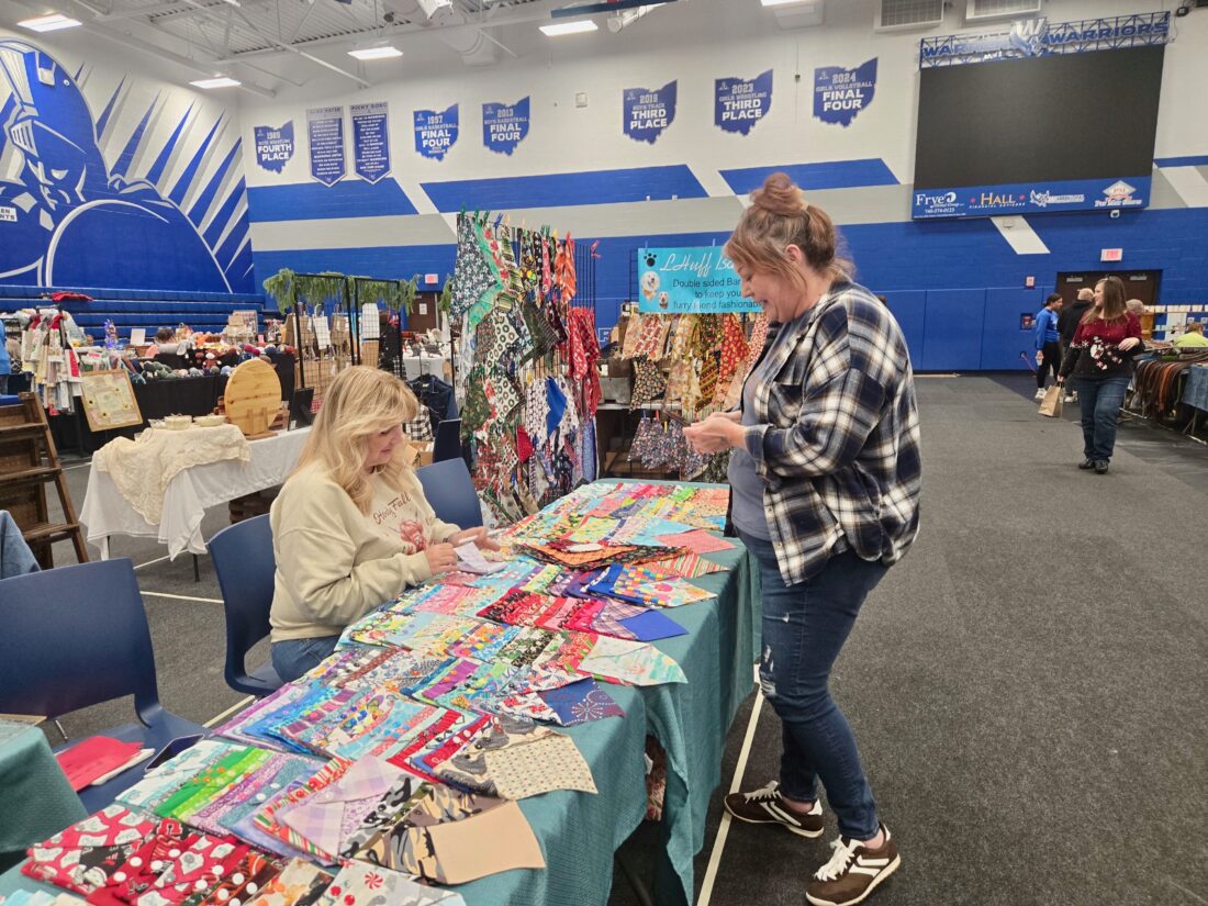 From left, Julie Huffman sells LHuff Bandanas to Jennifer Brannan Saturday at the Warren Local Band Boosters’ 46th annual Fall Arts and Crafts Fair. (Photo by Gwen Sour)