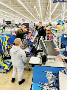 West Virginia Division of Natural Resources Officer C.M. Kimble, left, unloads items to check out as Vienna Police Detective Corey Richards waits in line behind him during the Fraternal Order of Police Local 79 Shop with a Cop event Sunday at the Parkersburg Walmart. According to FOP President R.S. Black, 101 kids participated, shopping with police officers for toys, clothes and any other items they might need at the Walmarts in Parkersburg and Vienna. Donations for the program come from local businesses and members of the community, Black said. (Photo Provided)