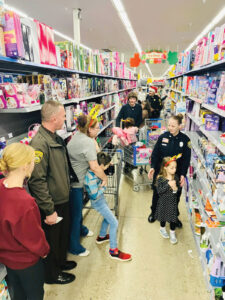 - Area law enforcement officers, volunteers and children participating in the Shop with a Cop program make their way through a toy aisle at the Vienna Walmart Sunday. According to FOP President R.S. Black, 101 kids participated, shopping with police officers for toys, clothes and any other items they might need at the Walmarts in Parkersburg and Vienna. Donations for the program come from local businesses and members of the community, Black said. (Photo Provided)