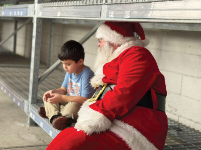 Santa Claus visits with a young Shop with a Cop participant Sunday at the Vienna Walmart. According to FOP President R.S. Black, 101 kids participated, shopping with police officers for toys, clothes and any other items they might need at the Walmarts in Parkersburg and Vienna. Donations for the program come from local businesses and members of the community, Black said. (Photo Provided)
