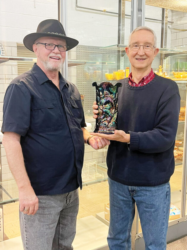 Randy Clark, left, with Dexter City Auction Gallery, and Chris Sieverdes, right, founder of the Millersburg Glass Museum in Millersburg, Ohio, hold a rare carnival glass vase which sold for a record $250,000 at auction in November 2024. Sieverdes purchased the vase for his museum with Clark as auctioneer. (File Photo)