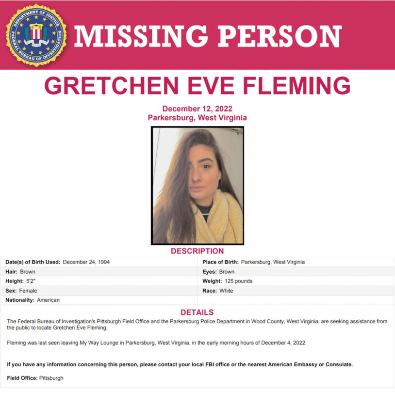 Fleming, a Parkersburg High School graduate, was 27 years old and living with her grandparents in Vienna when her family reported her missing on Dec. 12, 2022. Police determined she was last seen at the My Way Lounge at Fifth and Juliana streets in the early morning hours of Dec. 4. They identified a person of interest in the case, but that person has not been charged in connection with the case.