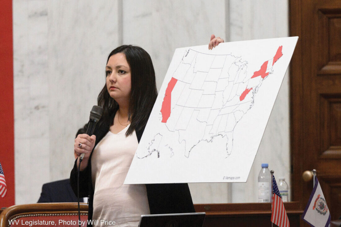 - In this Feb. 21 photo, Republican state Sen. Laura Wakim Chapman, chair of the West Virginia Senate Health and Human Resources Committee, holds a map of the U.S. on the state Senate floor depicting the states, including West Virginia, that do not allow religious or philosophical exemptions for required school vaccinations. (File Photo)