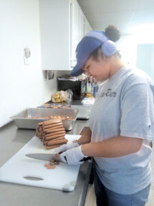 - Parkersburg High School senior Olivia Kennerly cuts up hot dogs while helping prepare meals to be delivered to local senior citizens. Kennerly regularly volunteers in the community and has the goal of eventually becoming a chef. She regularly volunteers at the Old Man Rivers Mission in Parkersburg, preparing food. (Photo Provided)