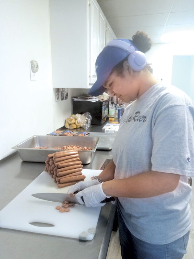 Parkersburg High School senior Olivia Kennerly cuts up hot dogs while helping prepare meals to be delivered to local senior citizens. Kennerly regularly volunteers in the community and has the goal of eventually becoming a chef. She regularly volunteers at the Old Man Rivers Mission in Parkersburg, preparing food. (Photo Provided)