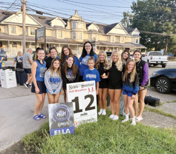 Ava Branham, far left, helps at water station 12 during The Parkersburg News and Sentinel 2025 Half Marathon with her Ohio Valley All-Star cheer team. Branham said the group, named Cheerleeders for Charity, finds ways to give back to the community.