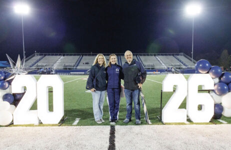 Ava Branham, center, poses with her parents, Erin and David Branham, during Parkersburg South High School’s Senior night. Branham said she plans to uphold the family tradition and attend West Virginia University after graduation where she will major in exercise physiology. (Photo Provided)