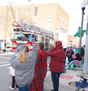 - Belpre resident Aliannah Duley gestures for a Vienna Fire Department truck to sound its horn as it rolls down Market Street Saturday during the Parkersburg Christmas Parade. (File Photo)