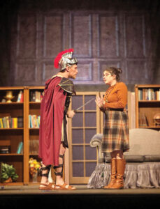 - Erin O’Neill as Thalia and R.J. Lowe as Dionysus in rehearsal for “The Gods of Comedy” by Ken Ludwig. The show runs at 7:30 p.m today, Saturday, Jan. 16 and Jan. 17 with a 3 p.m. matinee on Jan. 18. (Photo Provided)