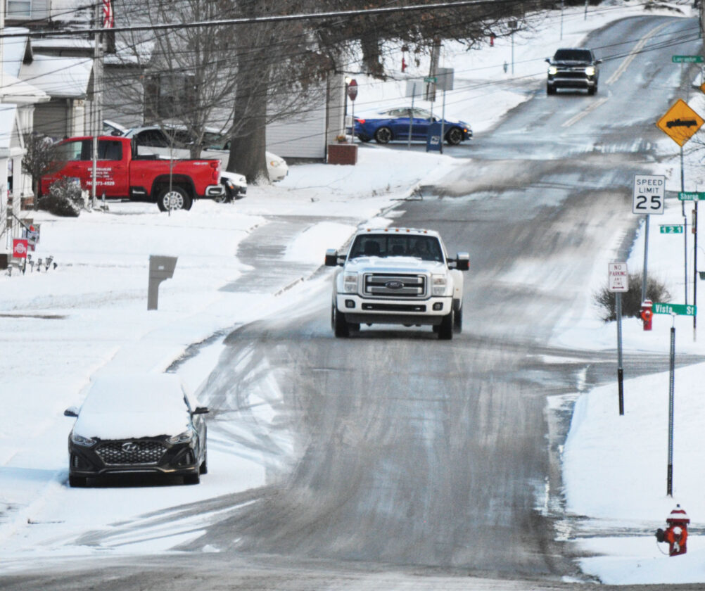 A light snow Thursday made for slick streets and roads for early morning drivers, including this one on Alta Street in Marietta. The snow caused Marietta City and Fort Frye, Frontier, Warren and Wolf Creek Local schools in Ohio and Doddridge, Pleasants, Roane, Tyler and Wetzel counties in West Virginia to cancel classes. Belpre City Schools was on a two-hour delay. (Photo by Art Smith)