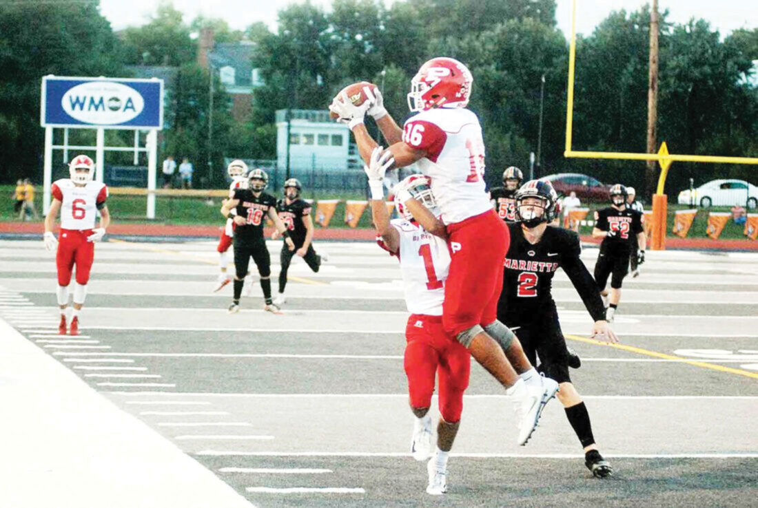 - Parkersburg’s Brenton Strange (16) makes a catch over teammate Braeden Mason (1) during a 2018 high school football game against Marietta at Don Drumm Stadium. (File Photo)