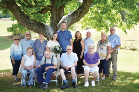 - D.J. and Ashleigh Cunningham’s wedding day at a Waterford farm July 11, 2020. From front left, Julia Brooker, Bernard “Buzzard” Brooker, Jack Cunningham, Emma Cunningham, back left, Brenda Eddy, Ivan Huck, Cindy Huck, Ashleigh Cunningham, D.J. Cunningham, Jean Hoops, Bob Hoops, Melissa Fisher and Tim Cunningham. (Photo Provided)