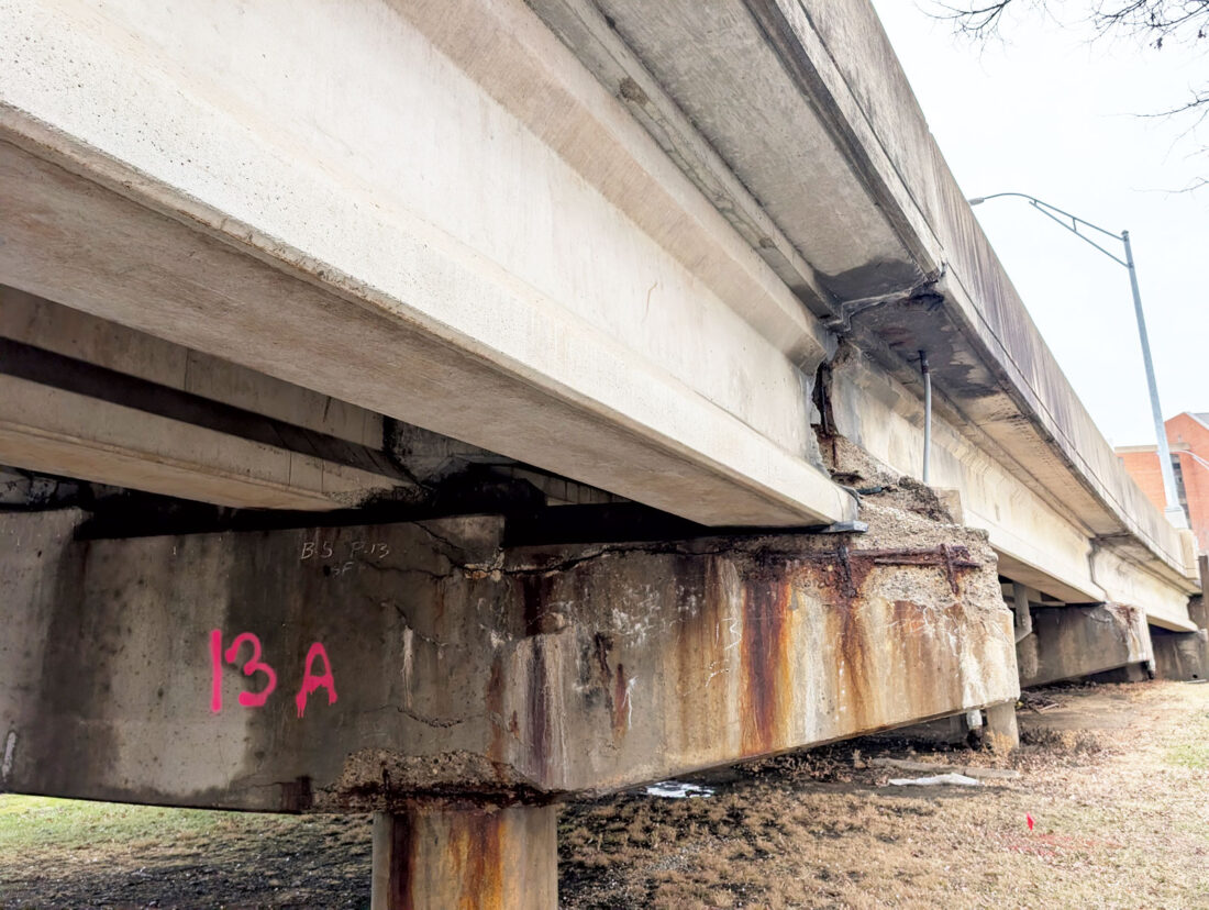 Concrete piers supporting the ramps to and from the Juliana Street Bridge in downtown Parkersburg will be replaced as part of a $17.5 million project set to get underway this year. The West Virginia Division of Highways says that in spite of wear like this, the ramps remain safe to use. (Photo by Evan Bevins)