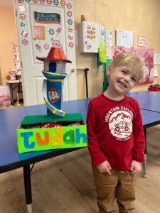 Photo provided Judah poses in front of his Valentine’s Day box created by Jackson Middle School seventh-graders for Olivia and Friends Childhood and Development Center.