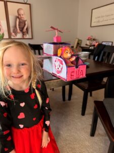 - Kaari poses for a picture with her Valentine’s Day box created by Jackson Middle School seventh-grader Orion Evans for Olivia and Friends Childhood and Development Center.