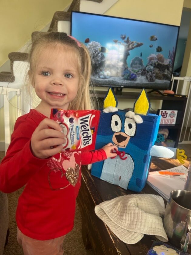 - Photo provided Fiadh holds up a pack of fruit snacks she received in her Bluey inspired Valentine’s Day box created by Jackson Middle School seventh-graders for Olivia and Friends Childhood and Development Center.