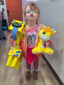 Photo provided Fiadh holds up a pack of fruit snacks she received in her Bluey inspired Valentine’s Day box created by Jackson Middle School seventh-graders for Olivia and Friends Childhood and Development Center.
