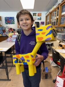 Jackson Middle School seventh-grader Orion Evans displays his giraffe themed box he created for Valentine's Day to give to younger kids at Olivia and Friends Childhood and Development Center.
