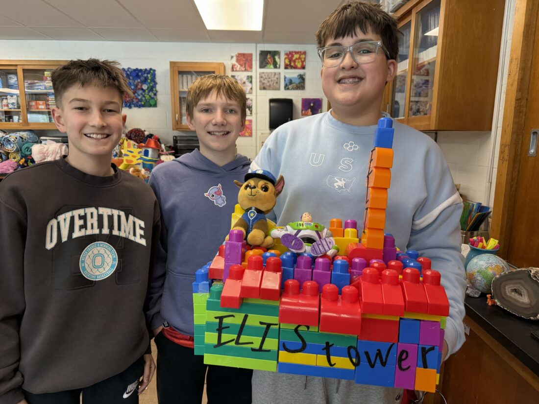 - Photo provided Jackson Middle School seventh-graders Chaney Brown, Cameron Underwood and Nikitas Vasilakis show the Lego inspired Valentine’s Day box the group made to give to younger kids at Olivia and Friends Childhood and Development Center.