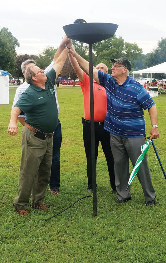 In August 2019, from left, Vienna Mayor Randy Rapp, Parkersburg Mayor Tom Joyce, Belpre Mayor Mike Lorentz and Marietta Mayor Joe Matthews kick off Belpre Homecoming by lighting the ceremonial torch together. (File Photo)
