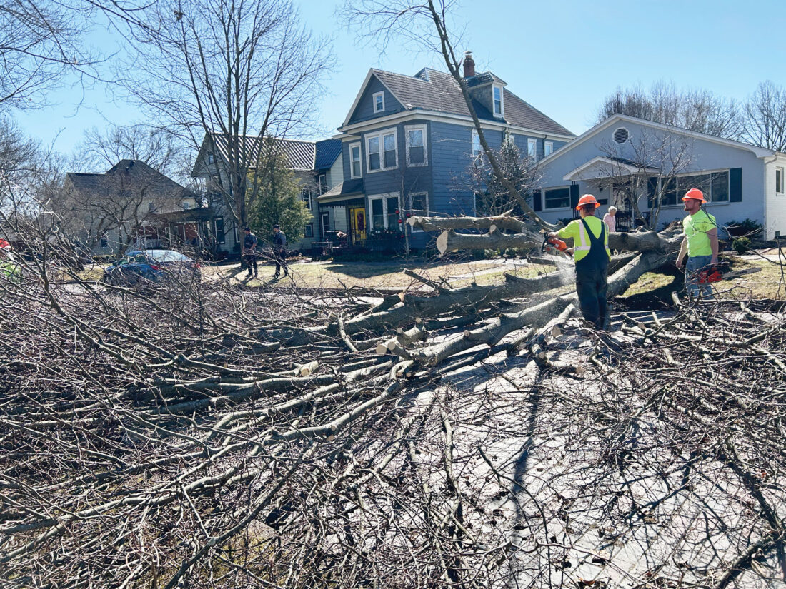 Crews work to remove a tree that fell across the 600 block of Sixth Street in Marietta during a windy Friday afternoon. AEP Ohio reported nearly 2,000 customers without power between Washington and Athens County around 1:30 p.m. About 700 were expected to have power restored by 2 p.m. Later in the day, more than 200 customers in the Cutler area were without power. Nearly 1,400 in Parkersburg were without electricity around 1:30, according to MonPower. That number had decreased to about 500 at 4:50 p.m. in January. In Wood County, reports indicated cable lines were down across the county. Additionally, a power line was taken down in front of Leavitt Funeral Home on Seventh Street. (Photo by Art Smith)