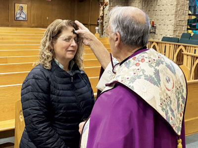 Judy Zingo receives the ashen cross from Father David Huffman during an Ash Wednesday service at St. Ambrose Catholic Church in Little Hocking. Huffman said Lent is a time to make spiritual resolutions and strengthen one’s relationship with God. It’s a time of spiritual preparation for Easter, which is 40 days away, excluding Sundays, with the number of 40 having a lot of religious significance in the Bible. (Photo by Brett Dunlap)