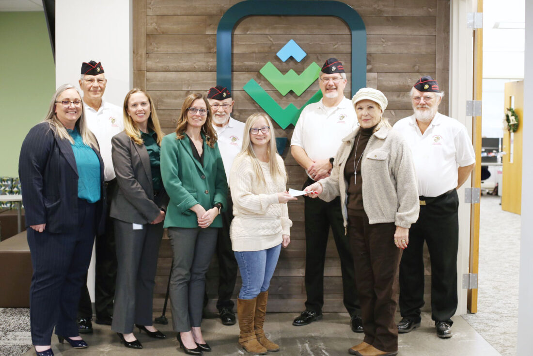 The Pickering Grant Check is presented to Tanya McWilliams from Reggie Pickering’s wife Janis Pickering during a ceremony recently on Washington State College of Ohio’s campus. Front row from left, Washington State Director of Student Success Amanda Stilgenbauer, Dean of Students Kathy Temple-Miller, President Sarah Parker, Navy veteran and liberal arts student Tanya McWilliams and Janis Pickering. Back row from left, James Heikkinen, Bernard “Bernie” Lyons, Marine Corps Veterans Association Commander Bryan Reeder and Robert Hockenberry. (Photo Provided)
