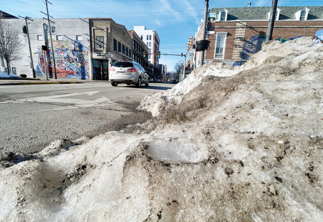 Recent warmer weather has melted much of the snow and ice leaving only the giant piles of snow on streets, like this one on Market Street, and parking lots. (Photo by Art Smith)