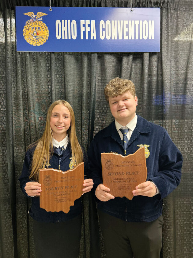 - Reagan Witten, left, and Parker Burris pose for a photo after placing top four in their respective proficiency areas at the 2025 Ohio FFA State Convention May 2, 2025. Burris was awarded in the Agricultural Communications area. (Photo provided by Parker Burris)