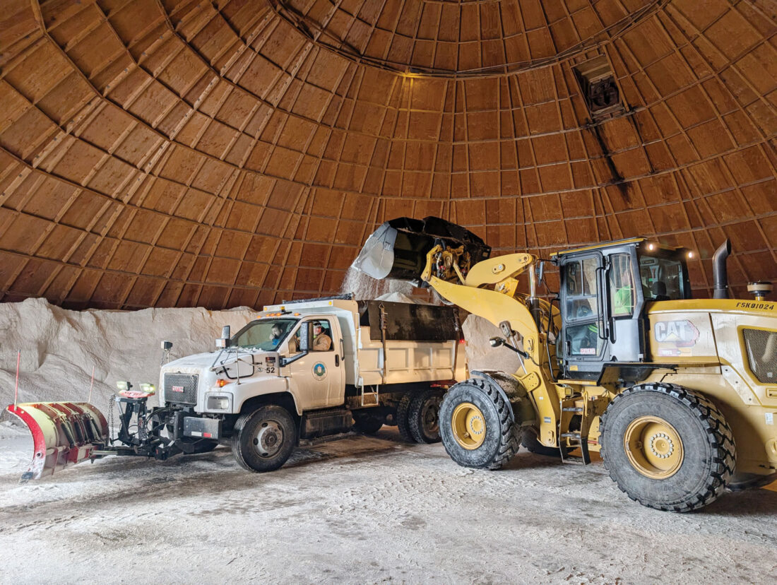 - A wheel loader dumps salt into a City of Parkersburg dump truck equipped with a spreader and plow at the city salt dome during Friday’s snowfall. (Photo by Evan Bevins)