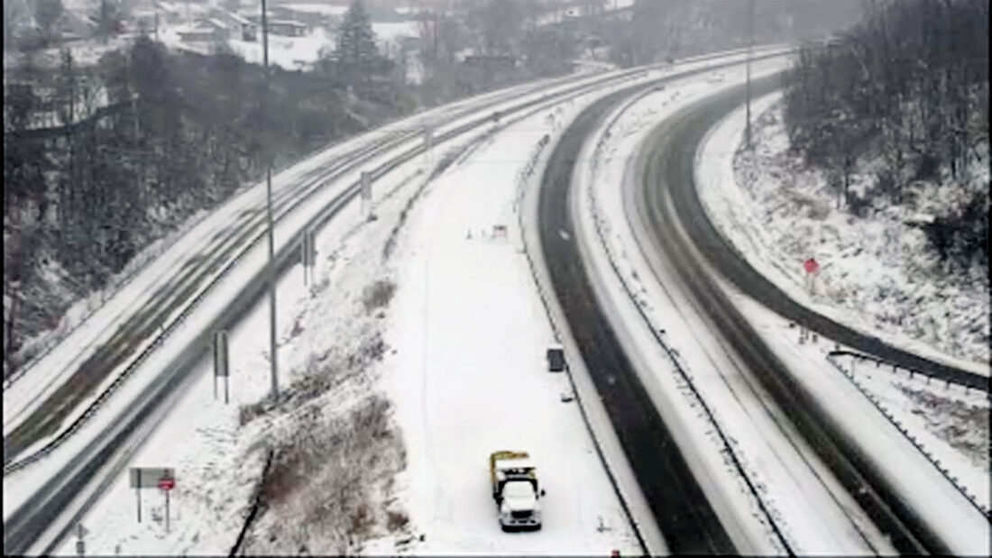 A screenshot from a West Virginia Department of Transportation traffic camera shows roads visible with snow on Interstate 77 near mile marker 176 Friday morning. (Photo from West Virginia Department of Transportation traffic camera)