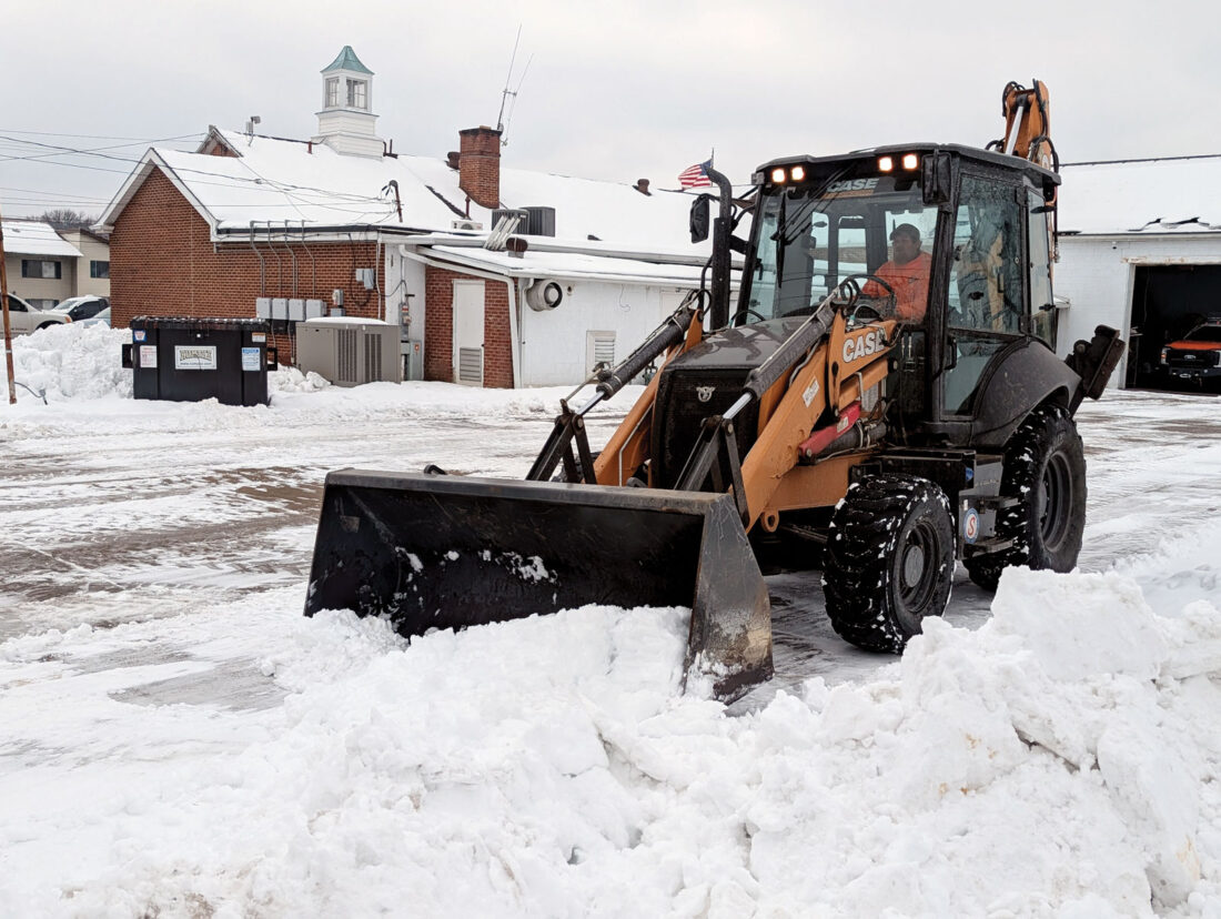 - Belpre Street Department Foreman Chris Barringer uses an excavator to clear snow from the Belpre Volunteer Fire Department lot off Stone Road Friday afternoon following new snowfall. (Photo by Evan Bevins)