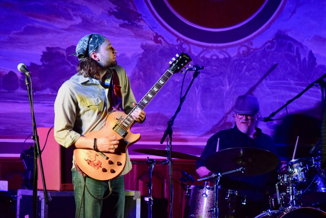 Guitarist Sean McKee performs on stage alongside drummer Ron James during Brandon Santini’s set at the 33rd River City Blues Festival at the Lafayette Hotel in Marietta Saturday. (Photo by Amber Phipps)
