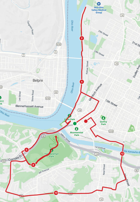 After exiting the park, the race course will return to the former route, taking Marrtown Road to West Virginia 95. It will stay on the road all the way to Division Street, where it will cross into a neighborhood before connecting with Pike Street a few blocks later. It will then cross the Little Kanawha River on the East Street Bridge before making a left turn onto Depot Street. The race will travel on the street to Green Street where it will turn left and connect to Eighth Street. Runners will turn left onto Market Street and head for the traditional finish line at Sixth and Market streets.