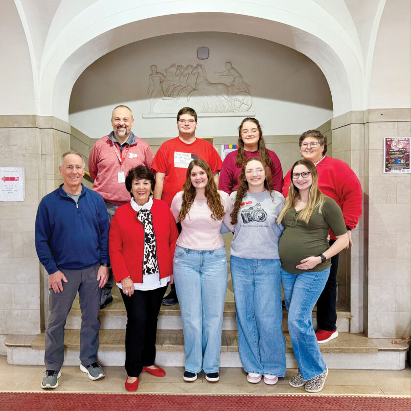 LEFT: Organizers and participants in the spring Easter celebration slated for Tuesday at Parkersburg High School pose for a picture at the school recently. Pictured are, front row, from left: Fred Earley, PHS Foundation president; Kiki Angelos, foundation board member and event co-chairwoman; Athena Staats, PHS A Cappella Choir and track team; Anabelle Schmidt, Student Council and Key Club; and Megan Ashcraft, special education teacher and student council co-adviser. Back row, from left: Jason Potts, PHS principal; Andrew Swisher, JROTC and Student Council; Kara Pascarella, vice president of Key Club; and Michelle Swisher special education teacher, student council co-adviser and event co-chairwoman. (Photo provided)