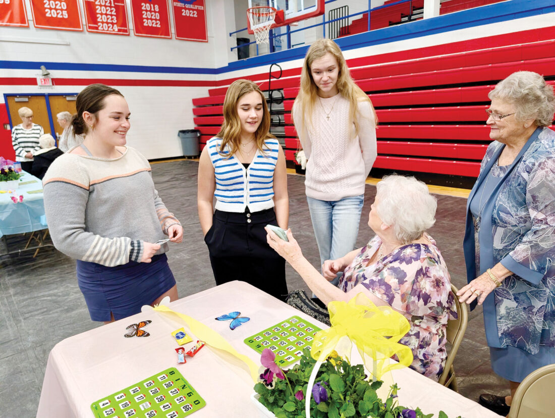 From left, Fort Frye High School juniors Hannah Weiker, Hazel Baker and Zoey Miller talk with Belpre resident Nancy Emerick, seated, Weiker’s grandmother, and her sister, Joe Frye, at the Senior Citizen Prom organized by the school’s Students Solving Problems club on Friday. (Photo by Evan Bevins)