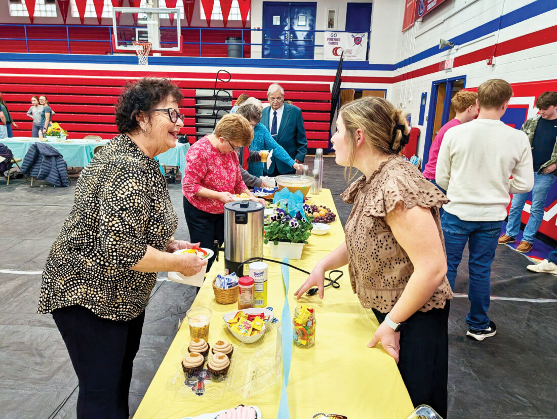 Marietta resident Cindy Ward, left, chats with Fort Frye High School junior Kallie Boley at the refreshment table during the Senior Citizen Prom put on Friday by the school’s Students Solving Problems club. (Photo by Evan Bevins)