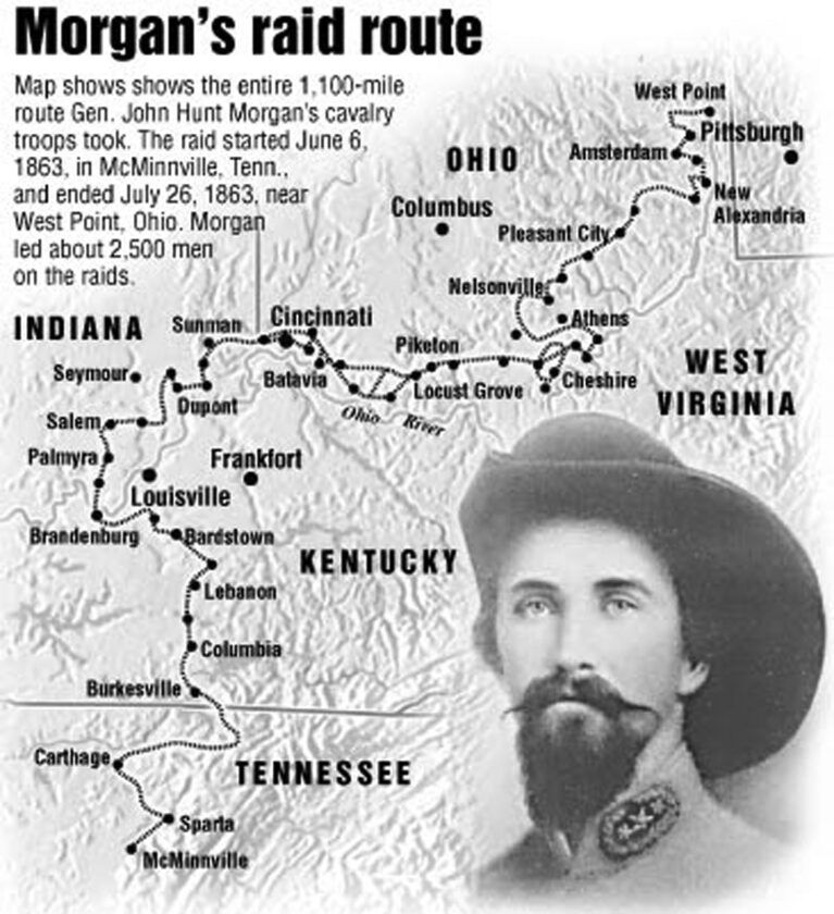 - Morgan’s “Great Raid,” the longest in the Civil War, began on June 6, 1863, when Gen. John H. Morgan and about 2,500 Confederate cavalrymen departed from McMinnville, Tenn., for raids in Kentucky. The raid ended on July 26, 1863, when Morgan and nearly 400 of his remaining men were captured at West Point, Ohio. (Photo Provided)