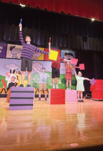 The entire company of “You’re a Good Man, Charlie Brown” performs “Book Report” in the Parkersburg High School production that opens at 7:30 p.m. March 19. (Photo Provided)